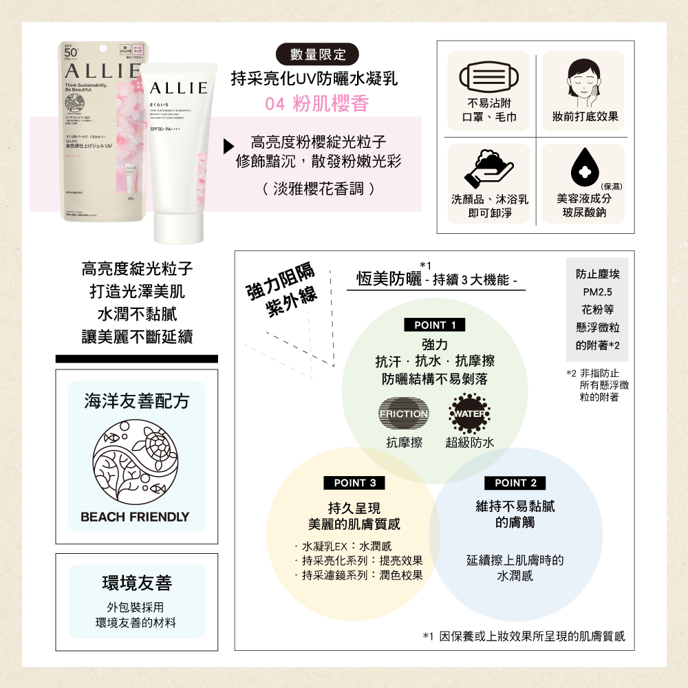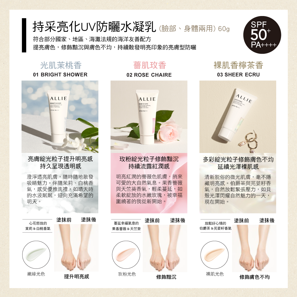 商品名稱:Kanebo 佳麗寶 ALLIE 持采亮化UV防曬水凝乳 60g(4款任選)