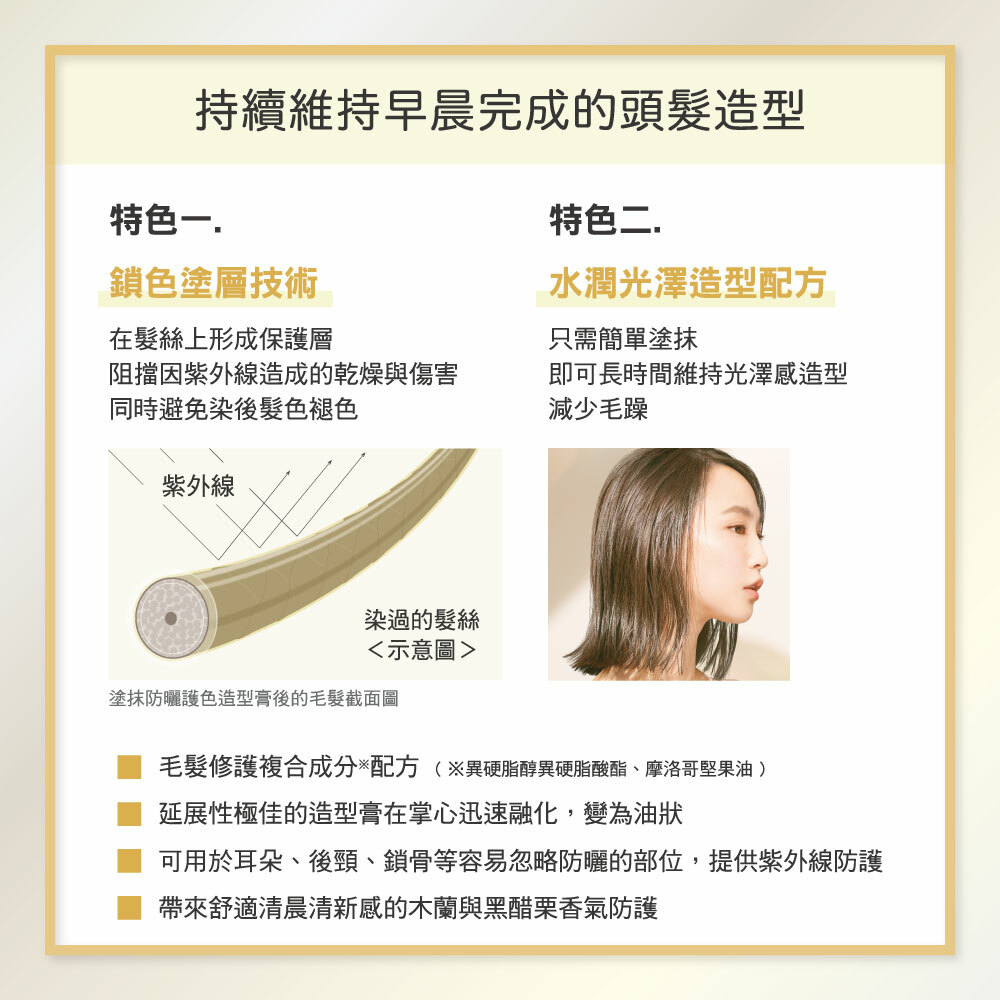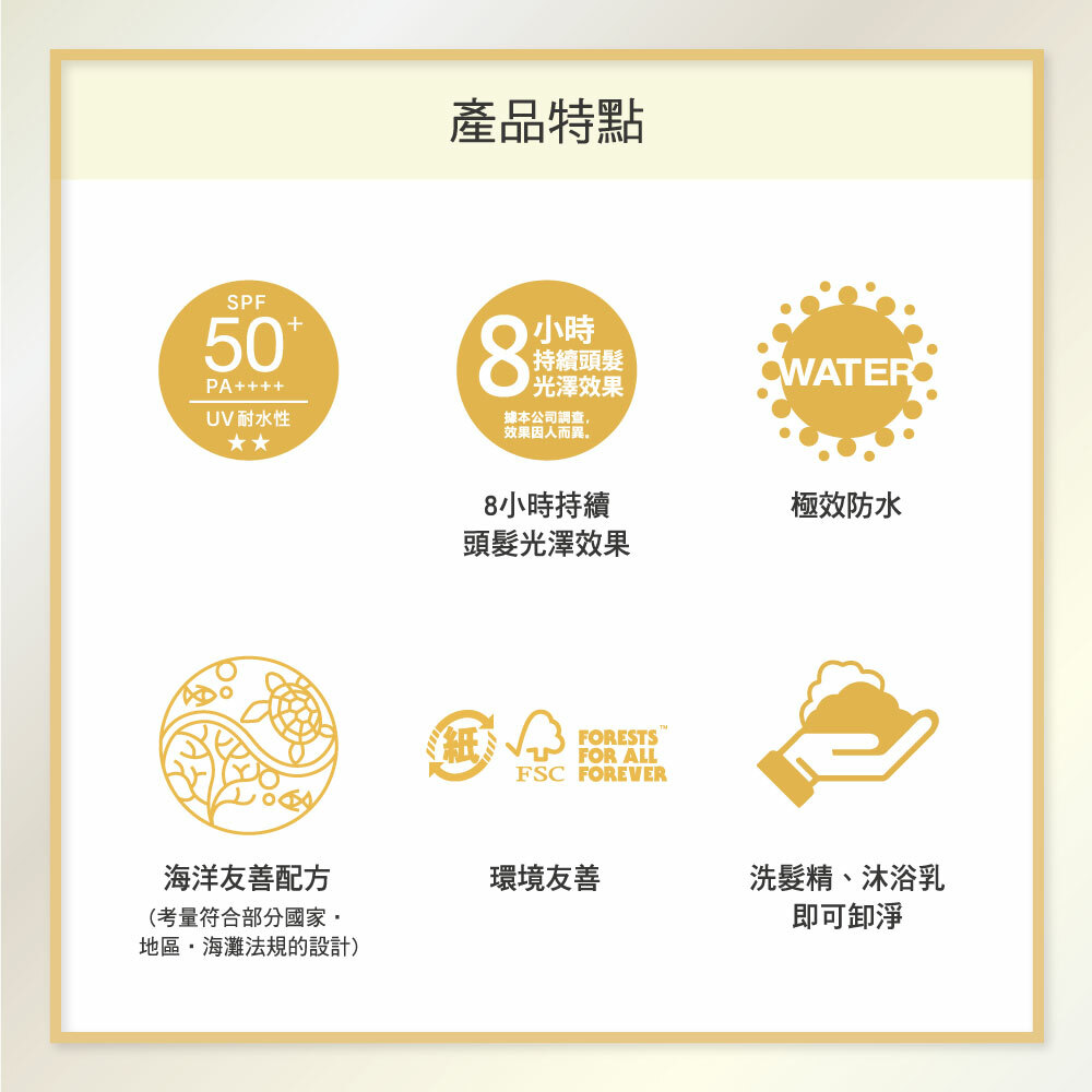 ◆防水防汗配方:即使在出汗或游泳後也能保持髮型和保護效果,是夏日活動的最佳夥伴。