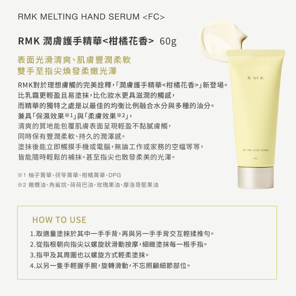 商品名稱: RMK 潤膚護手精華 (柑橘花香) 60g