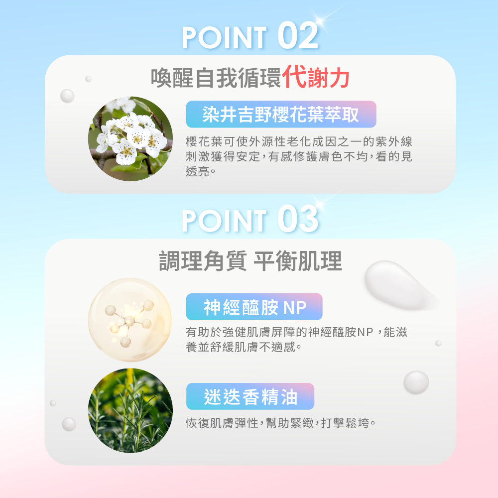 ◆ 幫助平衡肌膚狀態,提升肌膚的自我循環代謝力。